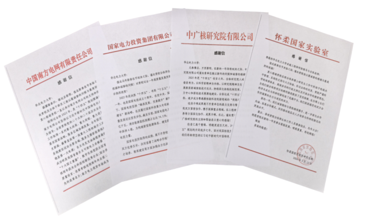 近日,学校及国家卓越工程师学院陆续收到中国南方电网有限责任公司、国家电力投资集团有限公司、中广核研究院有限公司、怀柔国家实验室等多家联合培养单位发来的感谢信。各单位在信中,对学院在能源电力领域卓越工程师培养工作中取得的成效予以高度认可,并对校企协同育人的合作成果表示充分肯定。